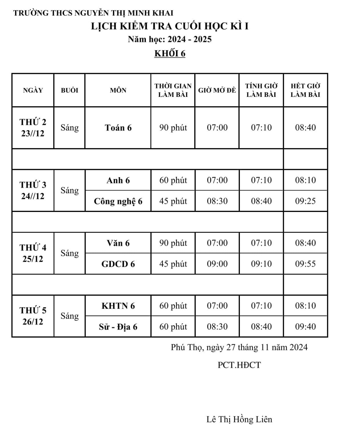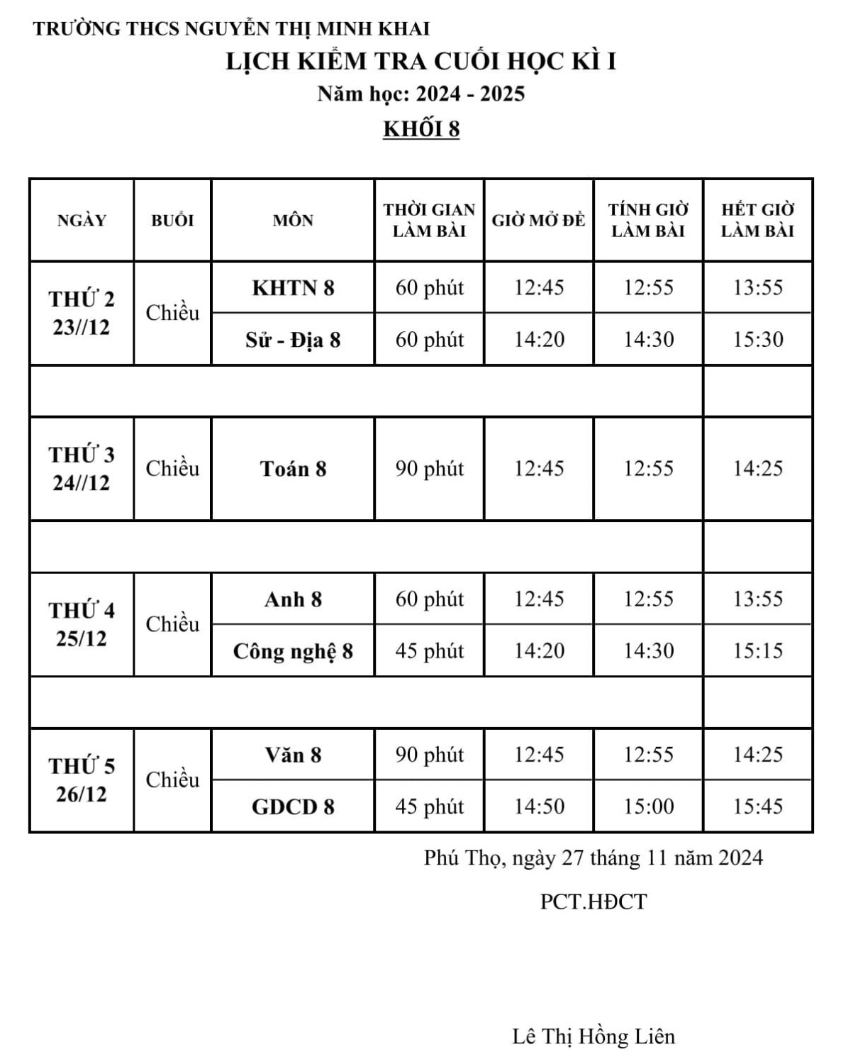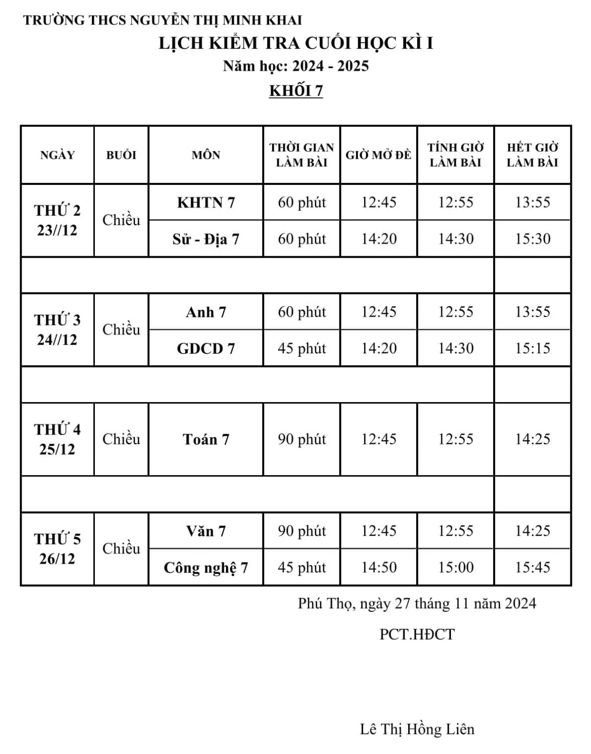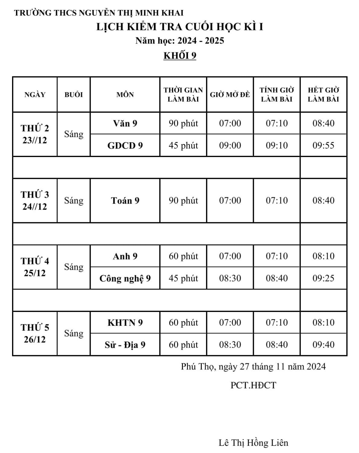 Lịch kiểm tra cuối học kỳ 1 năm học 2024 - 2025