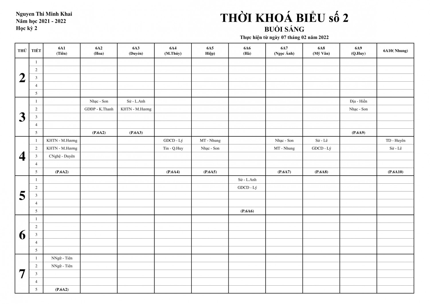Thời khóa biểu khối 6 (Áp dụng từ 07/02/2022)