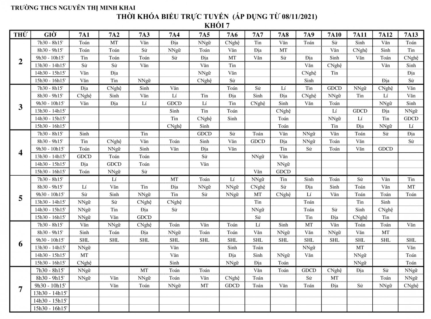 Thời khóa biểu khối 7 (Áp dụng từ 08/11/2021)