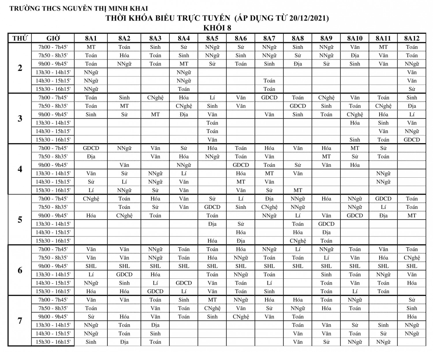Thời khóa biểu khối 8 (Áp dụng từ 20/12/2021)