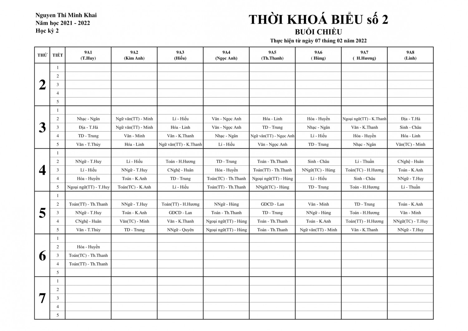 Thời khóa biểu khối 9 (Áp dụng từ 07/02/2022)