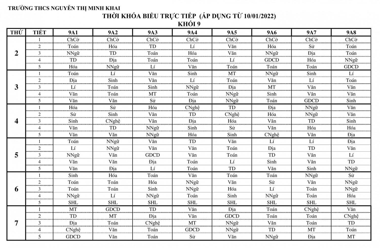 Thời khóa biểu khối 9 (Áp dụng từ 10/01/2022)