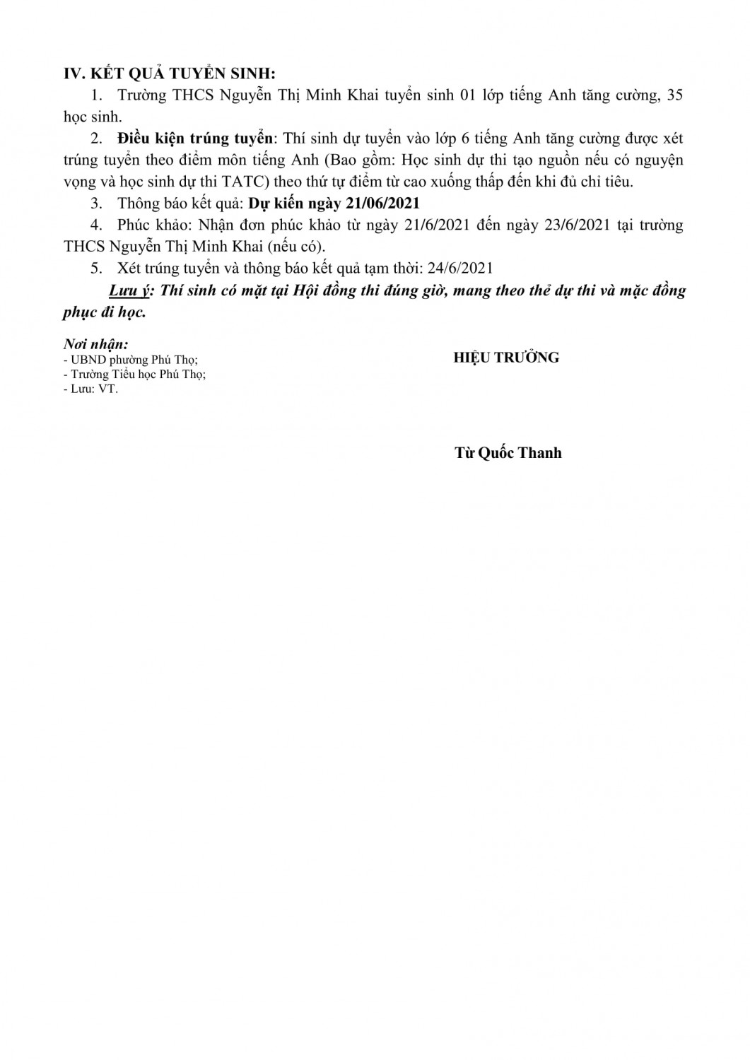 Thông báo tuyển sinh vào lớp 6 năm học 2021 - 2022 đợt 2